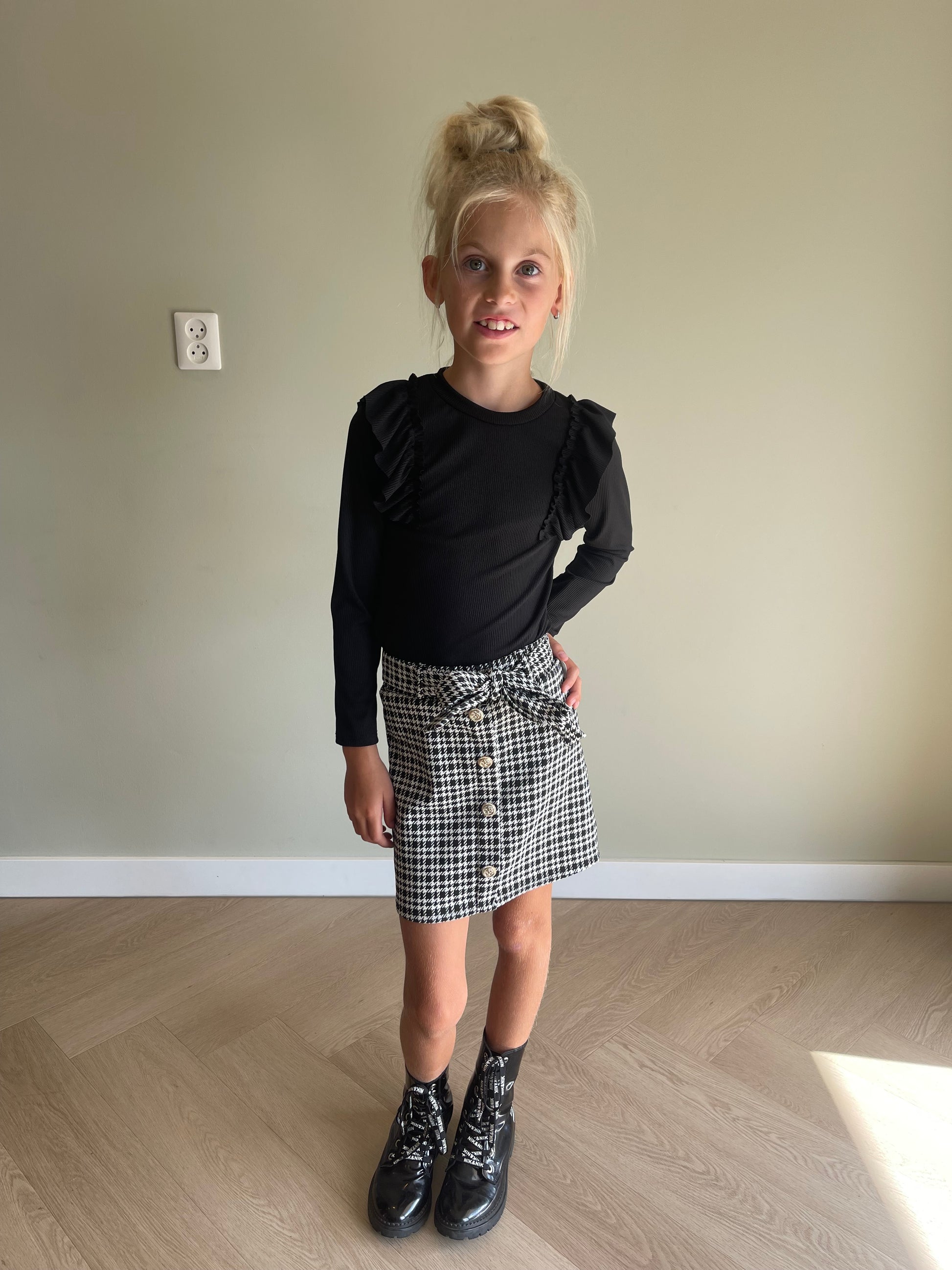 Dit zwart-wit geblokte rokje heeft een vaste tailleband met een mooie strik aan de voorkant. De gouden sierknoopjes maken het helemaal af en geven het rokje een chique uitstraling.