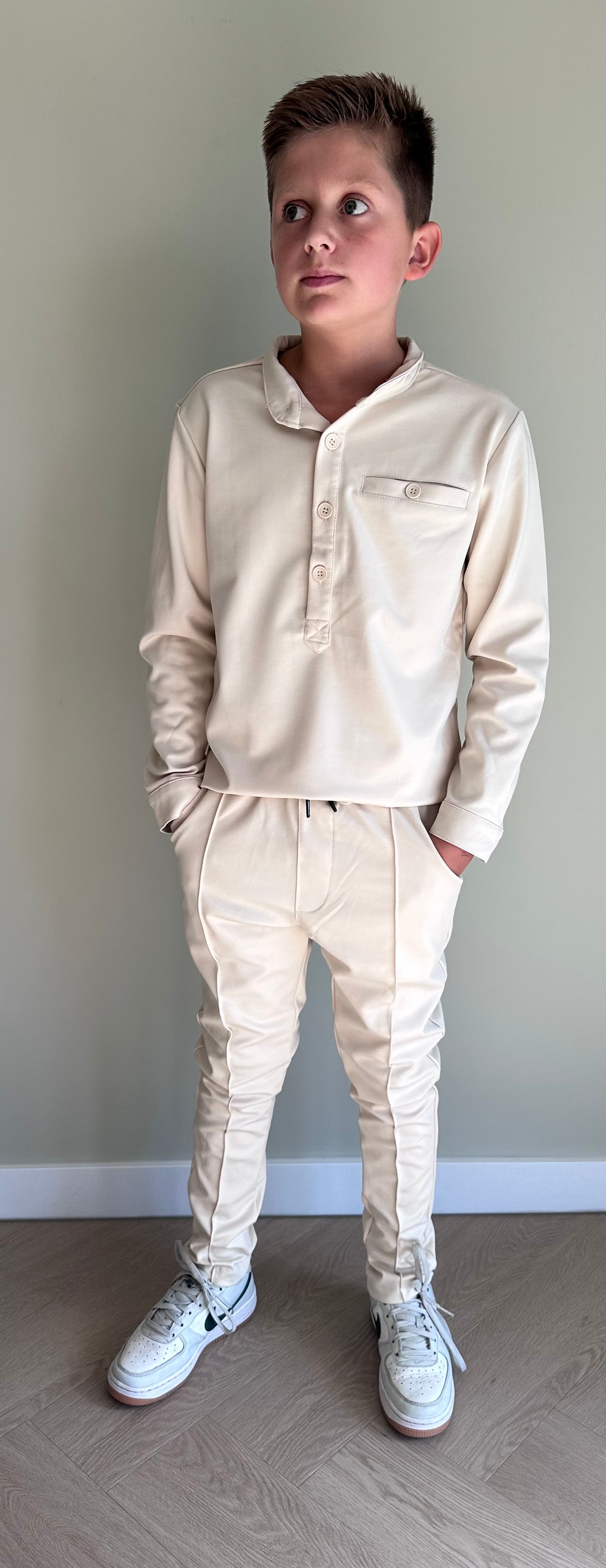 Deze stijlvolle beige set bestaat uit een zachte trui met knoopjes voor een blouse-effect en een perfect bijpassende pantalon. Comfortabel om te dragen, ideaal voor nu én prachtig voor de feestdagen.
