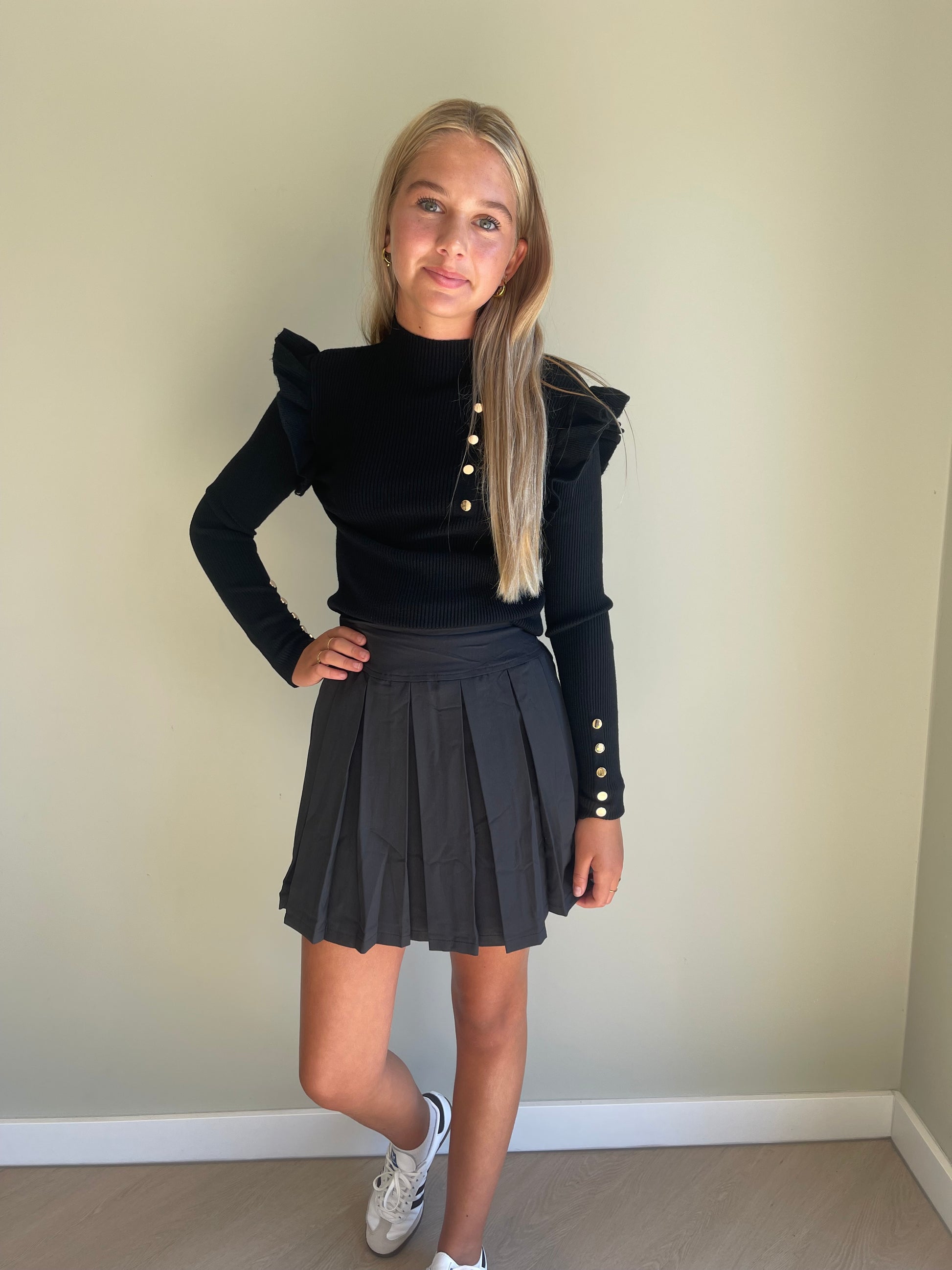 - foto 1: Stijlvol en elegant! Model met zwarte top draagt maat 164 (14) en is 1,67m