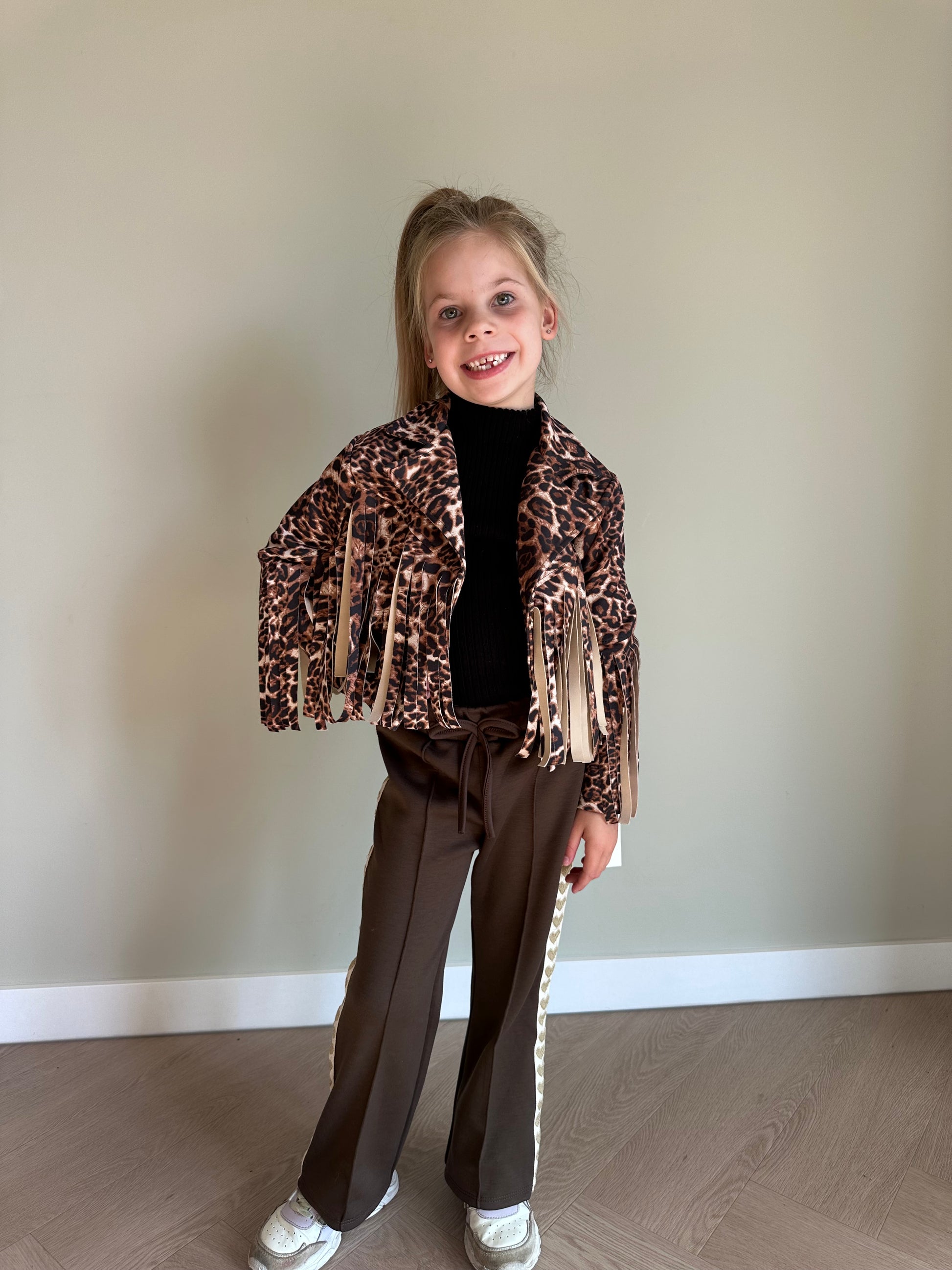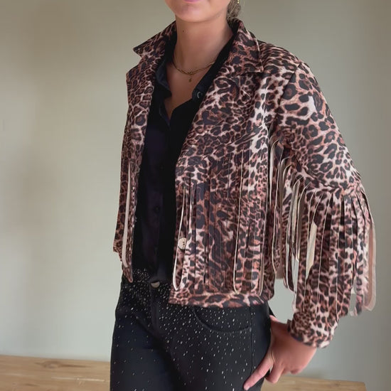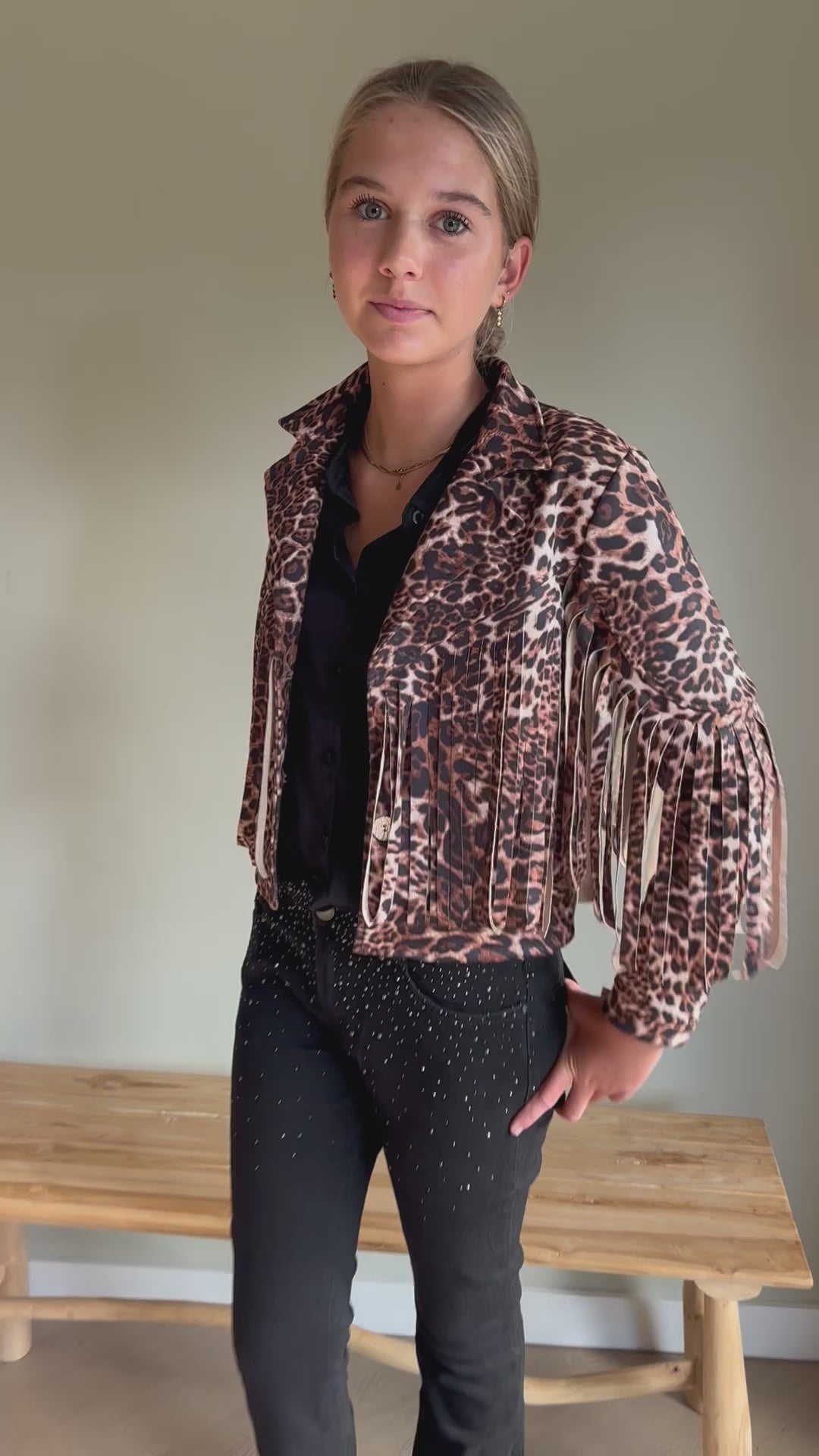Deze opvallende jasje met panterprint is een echte eyecatcher! De speelse sliertjes aan de mouwen geven 'm een unieke touch, en dankzij het goudkleurige detail kun je hem ook dicht dragen. Draag 'm als jasje op warmere dagen en als stijlvolle blazer tijdens de koudere maanden.