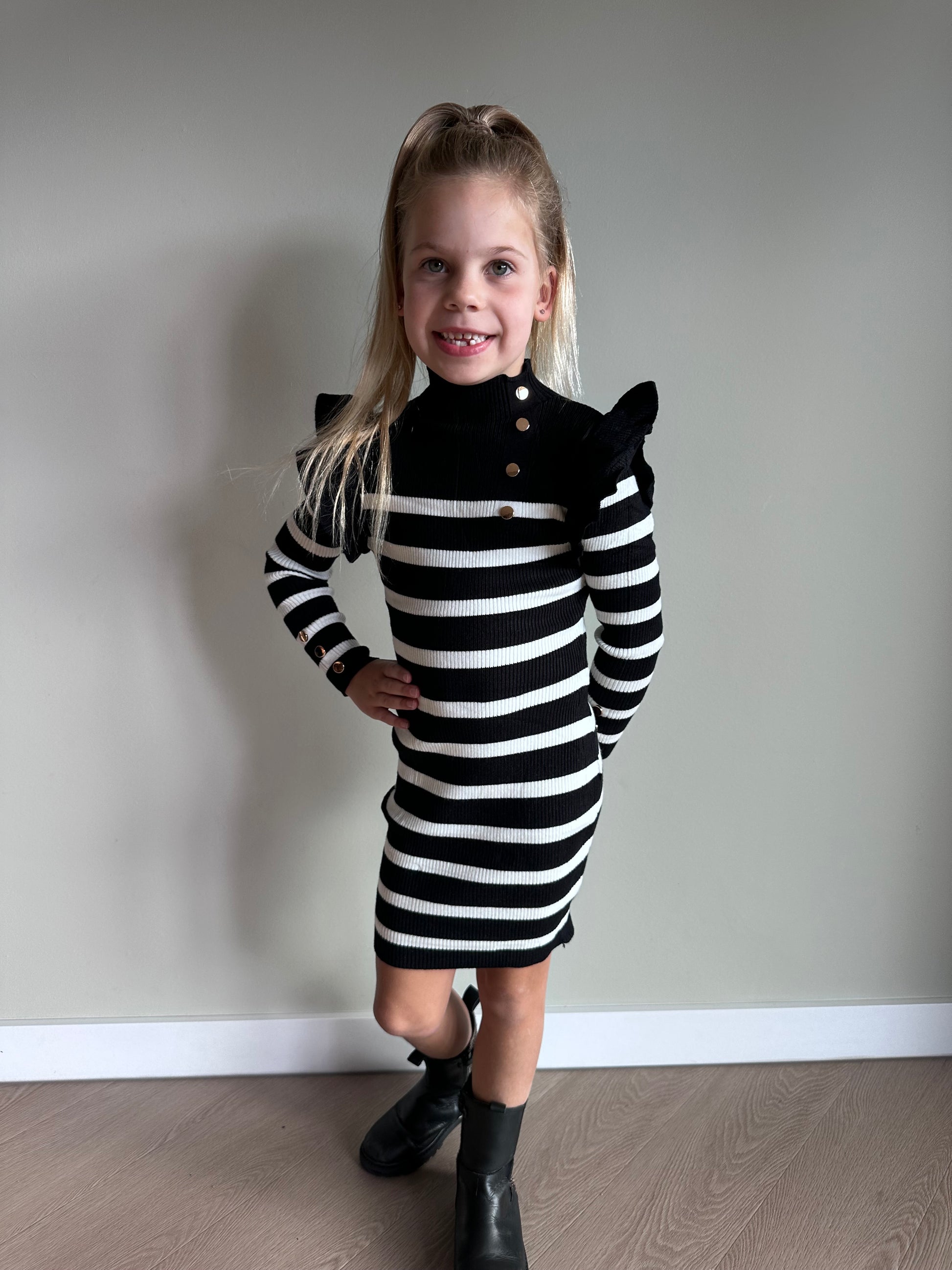 Zwart-wit gestreepte jurk met ruffle en goudkleurige details